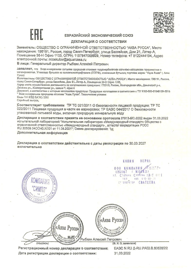 Вода Аква Русса отличается богатым минеральным составом с преобладанием натрия, а также высоким pH-показателем 8.1.