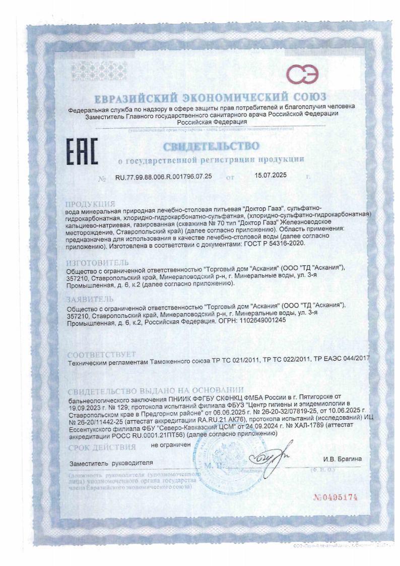 Вода минеральная природная лечебно-столовая газированная. Медицинские показания к применению: болезни пищевода, желудка, кишечника, печени, желчного пузыря и желчновыводящих путей; болезни обмена веществ, мочевыводящих путей. Минеральная вода применяется при вышеуказанных заболеваниях только вне фазы обострения. Легкая, мягкая, с приятной степенью газации, минеральная вода «Аскания» прекрасно утоляет жажду и восполняет баланс минеральных веществ.