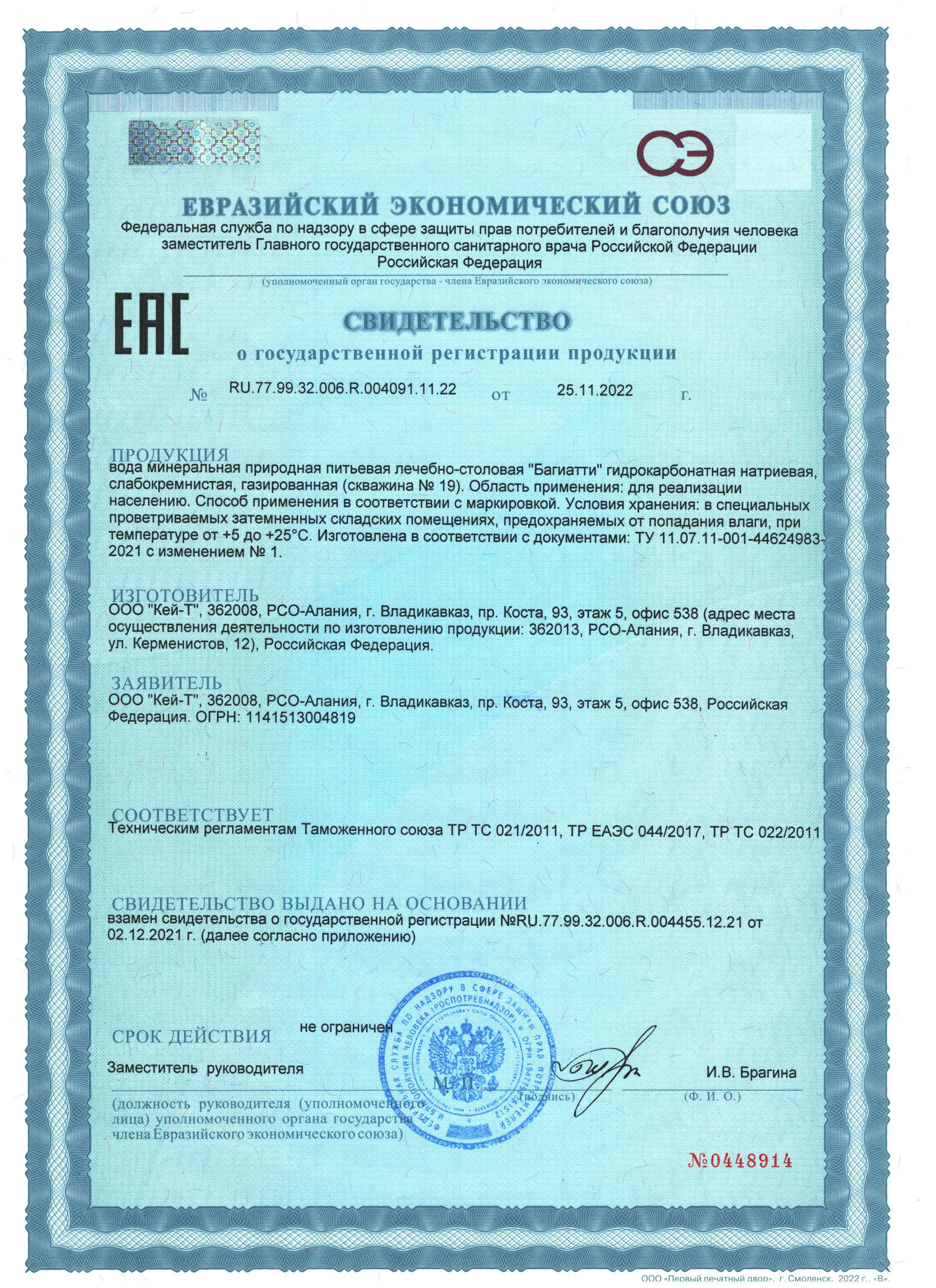 По своему составу природная минеральная вода «Багиатти» близка к водам знаменитого французского курорта Виши. Наличие метакремниевой кислоты позволяет дополнительно квалифицировать воду «Багиатти» как «кремнистую». Кремний – элемент жизни, необходимый для сбалансированной работы и усвоения микро- и макроэлементов. Кремний необходим для формирования костей, хрящей и построения нервных клеток, активно участвует в системе свертывания крови. Принимая минеральную воду «Багиатти», Вы почувствуете прилив сил и энергии, а также легкость. Не только физическую легкость стройной фигуры, но и ту особую легкость, которая помогает нам с истинным удовольствием заниматься спортом, следить за собой, быть всегда в форме. Категория: маломинерализованная питьевая лечебно-столовая вода, что позволяет употреблять ее не только в медицинских целях, но включать в каждодневный рацион. По температуре: относится к группе термальных источников. Гидрохимическая группа: по основному ионному составу входит в I-ю группу минеральных вод гидрокарбонатно-натриевого состава