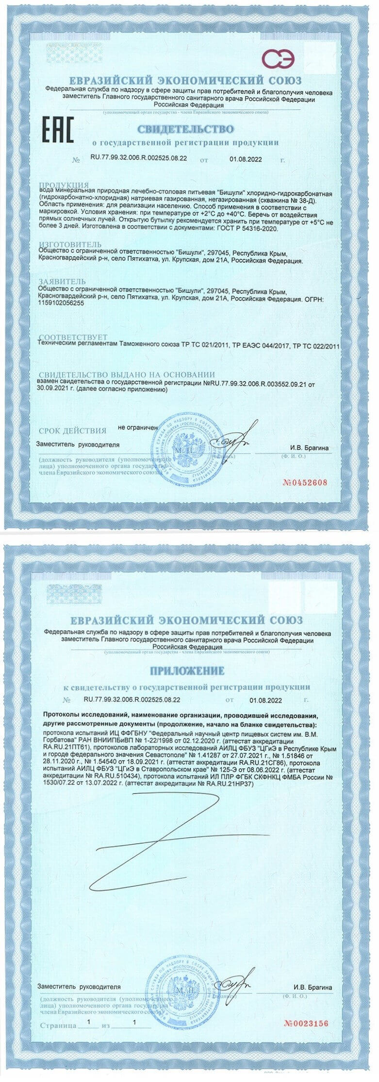 Бишули - уникальная реликтовая структурированная вода добывается в Крыму из подземного резервуара в экологически чистом районе. Глубина скважины 1 км 190 метров. Температура на выходе из источника +53 градуса, доказанный возраст воды более 21000 лет.