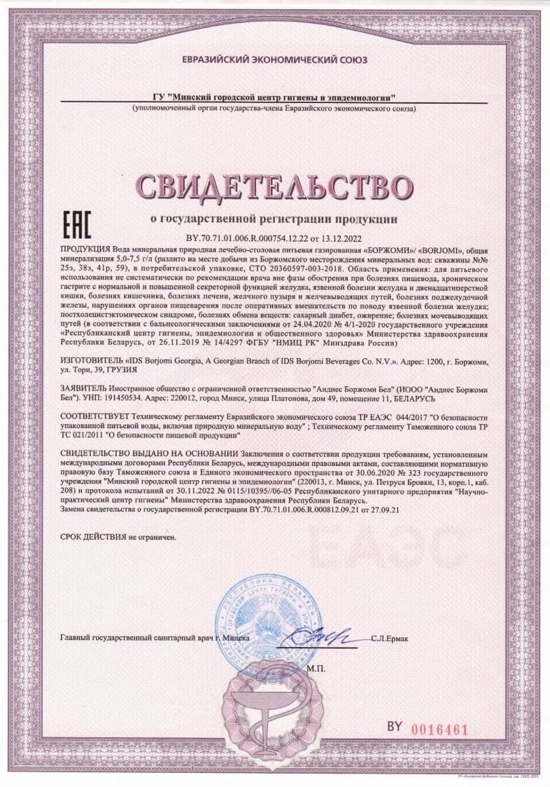 *Химический состав природной минеральной воды «Боржоми» соответствует комбинации растворенных форм более чем 60 минеральных солей природного происхождения