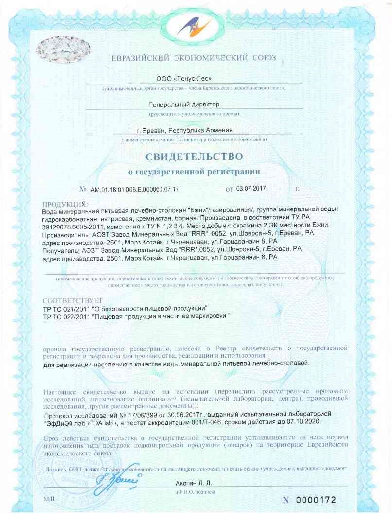 «Бжни» («Bjni») — лечебно-столовая среднеминерализованная гидрокарбонатно-натриевая кремнистая борная питьевая минеральная вода.