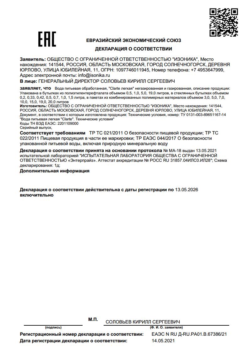 Легкая особо чистая питьевая вода Clarte – это вода с большим количеством легких молекул. Содержание легких молекул в составе воды Clarte соответствует их содержанию в составе реликтовых антарктических льдов, образовавшихся десятки тысячелетий назад (стандарт SLAP).