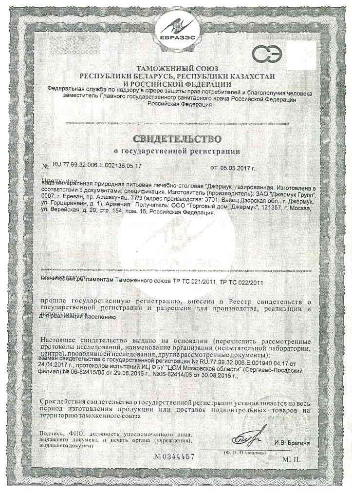 В качестве лечебно-столовой минеральной воды "Джермук" рекомендуется для профилактики и лечения желудочно кишечного тракта (язвенная болезнь желудка и 12-перстной кишки, гастриты), воспалительных заболеваний печени, желчного пузыря, поджелудочной железы и периферической нервной системы, нарушений обменных процессов(сахарный диабет, мочекислый диатез), гинекологических заболеваний. По своему химическому составу она близка к водам Железноводска и Карловых Вар, но по своим прекрасным вкусовым качествам не имеет аналогов в мире.