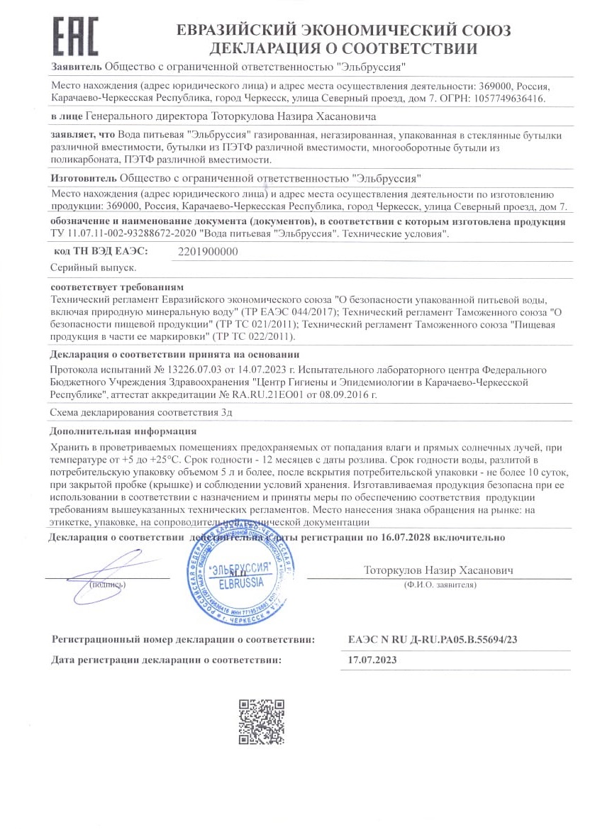 Вода добывается из скважины №7, расположенной на северном склоне Главного Кавказского хребта между высокогорным курортом Домбай и Архызским участком Тебердинского государственного биосферного заповедника в Аксаутском ущелье на Кардоникском месторождении подземных вод. В уникальный состав воды "Эльбруссия" входят такие микроэлементы как: кальций, калий, натрий, магний, вещества, без которых не может жить и расти человек. Поэтому сбалансированная, чистая, природная питьевая вода "Эльбруссия" прекрасно подходит как взрослых, так и для детей.