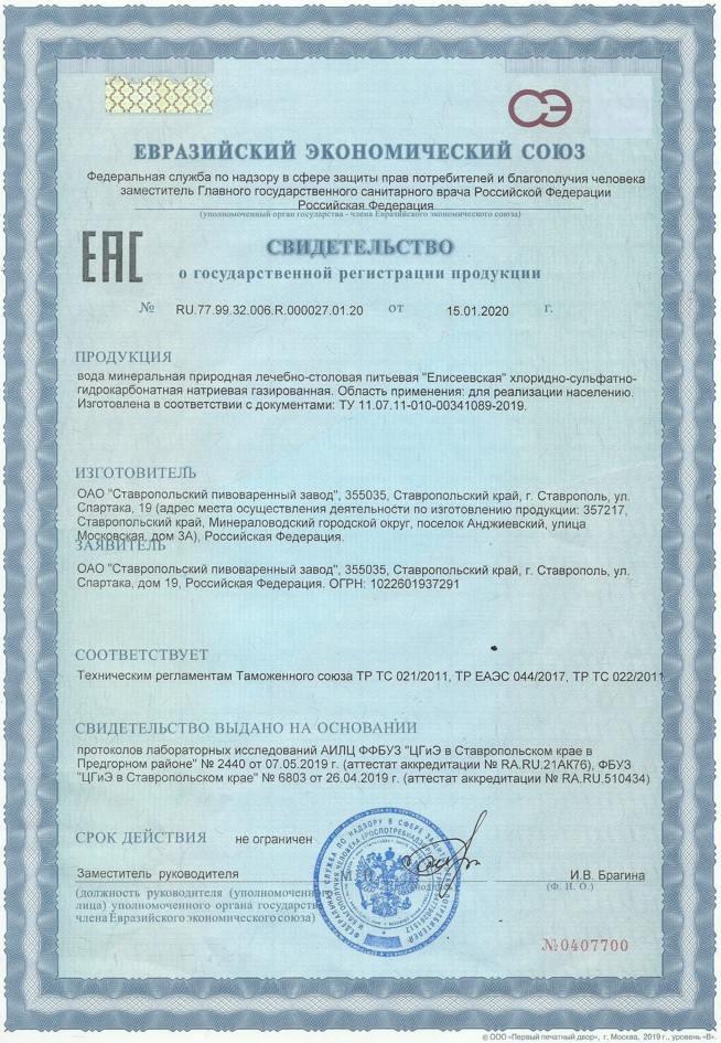 Минеральная вода «Елисеевская» содержит природный йод - 0,34 мг/л, что способствует улучшению обмена веществ, активизации окислительно-востановительных процессов и нормальному функционированию щитовидной железы.