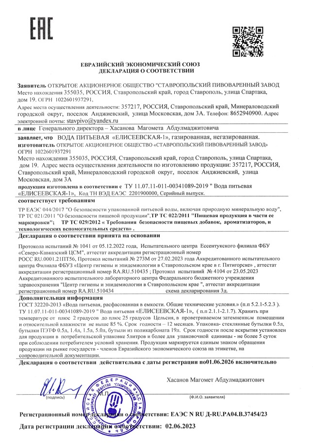 Рекомендации к применению или лечению Согласно результатам клинических исследований ГНИИ КУРОРТОЛОГИИ г. Пятигорск вода рекомендована к применению без ограничений, для повседневного употребления и приготовления пищи и напитков. Сведения об источнике Питьевая природная вода «Елисеевская» первой категории добывается из Малкинского месторождения пресных вод, которое находится на территории эколого-курортного региона Кавказских Минеральных Вод. Условия хранения Срок годности воды «Елисеевская» 12 мес. Со дня розлива при температуре хранения от +5С, до +20С. Производитель ЗАО Ставропольский пивоваренный завод.