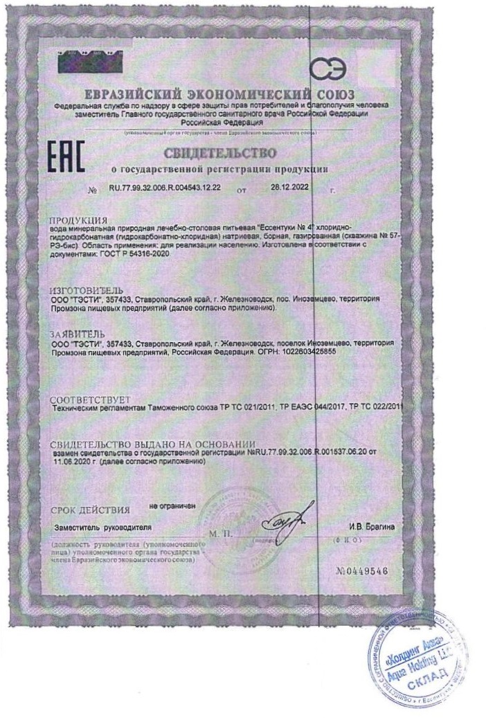 Вода минеральная природная питьевая лечебно-столовая газированная «Ессентуки №4». Хлоридно-гидрокарбонатная натриевая, борная.