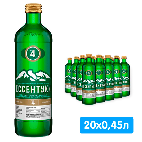 «Ессентуки №4» — вода минеральная природная лечебно-столовая питьевая газированная. Хлоридно-гидрокарбонатная (гидрокарбонатно-хлоридная) натриевая, борная средней минерализации 7-10 г/л. Обладает мягким солоноватым вкусом.