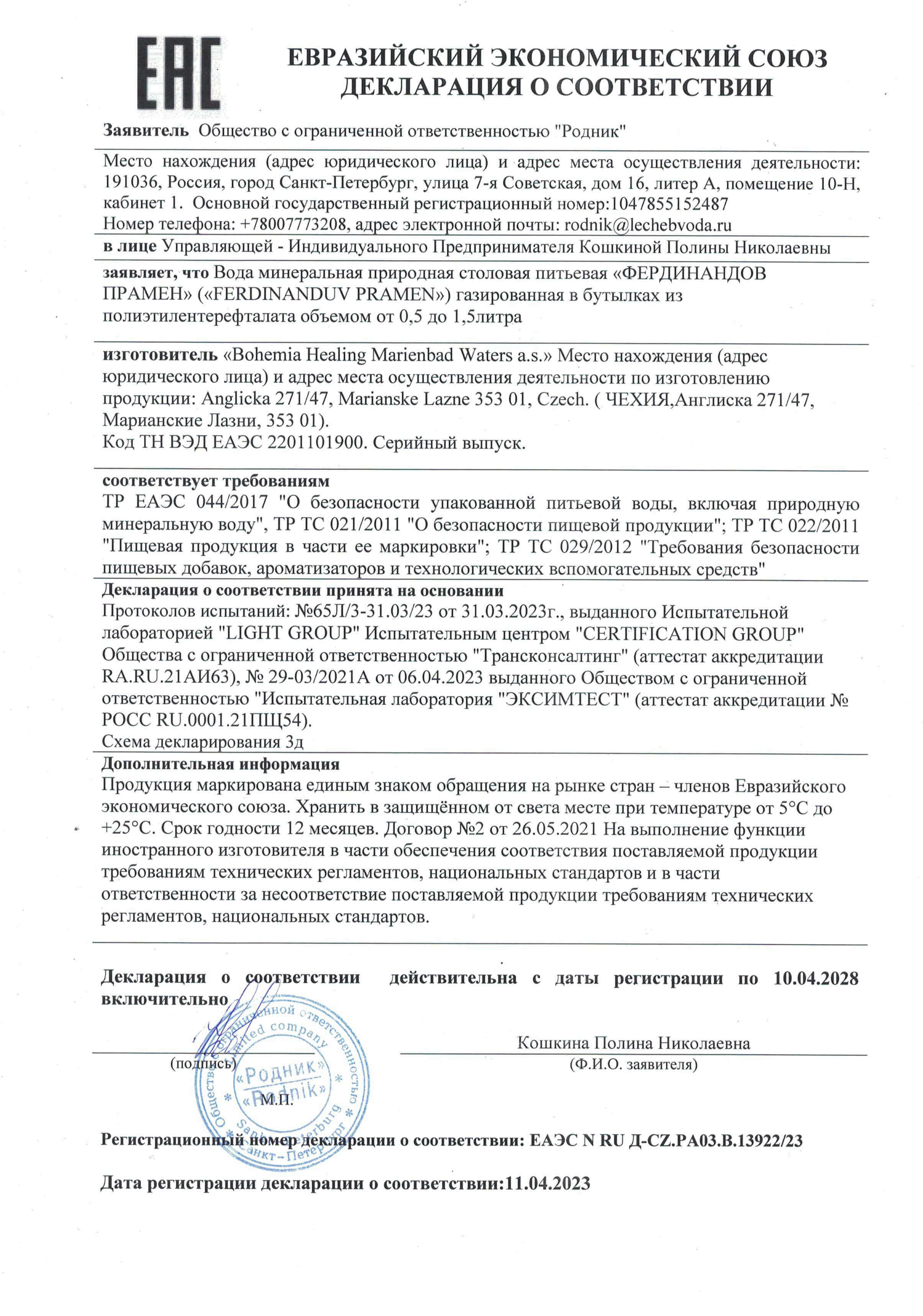 Вода сохраняет прочность связок и костей, подвижность суставов, защищает организм от вредных соединений (солей тяжелых металлов), укрепляет иммунитет. Кремниевая кислота – верный помощник для поддержания молодости и здоровья кожи за счет укрепления соединительной ткани и усиления гидратации. Кроме того, при употреблении Фердинандов Прамен в качестве постоянного питья, значительно улучшается внешний вид и состояние волос, ногтей и зубов. Полезная вода для всех членов семьи – это Фердинандов Прамен!