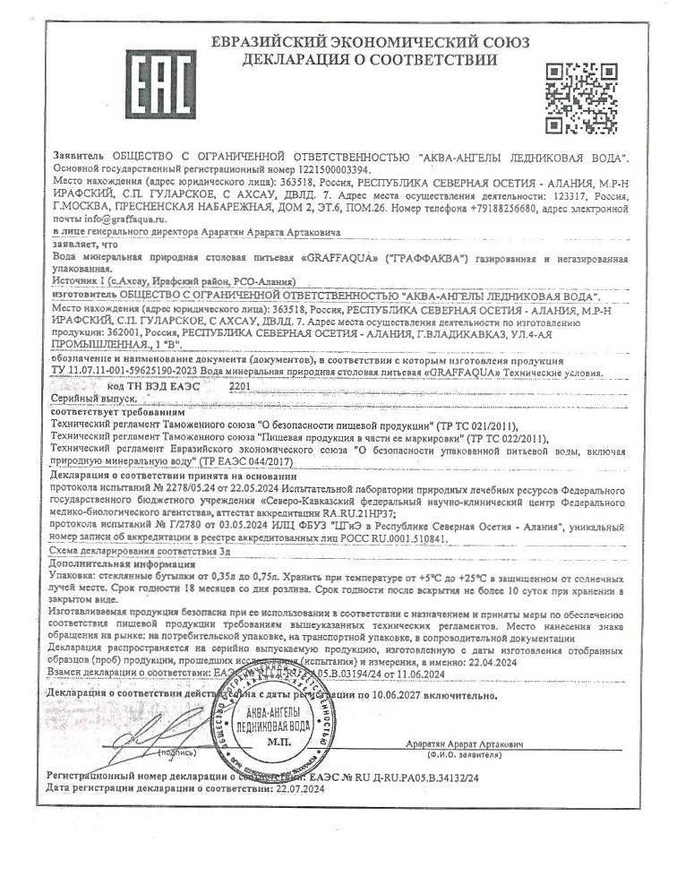 Кристально чистая природная вода Graffaqua с богатой минерализацией и оптимальным уровнем pH (7,8) создана для поддержания здоровья организма человека. Минеральный состав воды придает ей особые свойства, способствующие улучшению обмена веществ и общему оздоровлению. Горный источник расположен вблизи с. Ахсау, где непосредственно осуществляется розлив. Вода проходит стадию бережной очистки методом озонирования для сохранения своей природной безупречности.