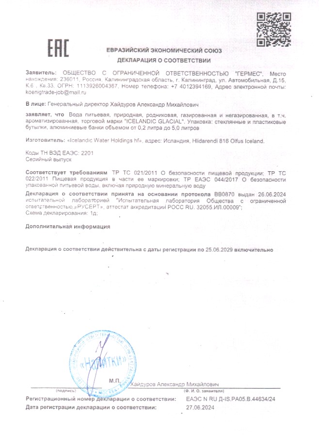 Вода Icelandic Glacial - ледниковая вода из Исландии класса Super Premium, добываемая из подземного, возобновляемого источника Олфус (Olfus), образованного 4500 лет назад при вулканическом извержении в Исландии.