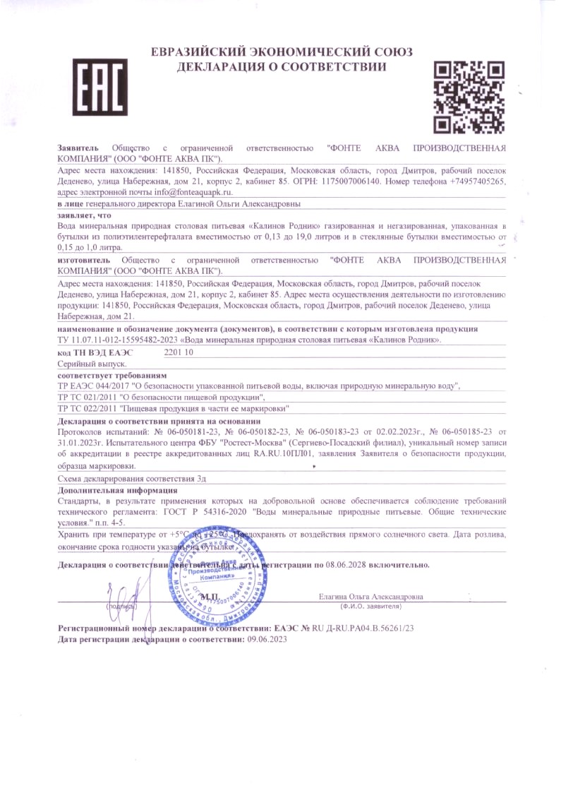 Вода минеральная природная столовая питьевая «Калинов Родник» Негазированная Гидрокарбонатная магниево-кальциевая добывается с глубины 155 метров из источника чистой зоны Дмитровского района Московской области. Тщательная работа по выбору скважины была проведена с учётом экологической безопасности района добычи и самого состава воды: в ней отсутствуют нежелательные примеси, нитраты, соли, тяжёлые металлы.