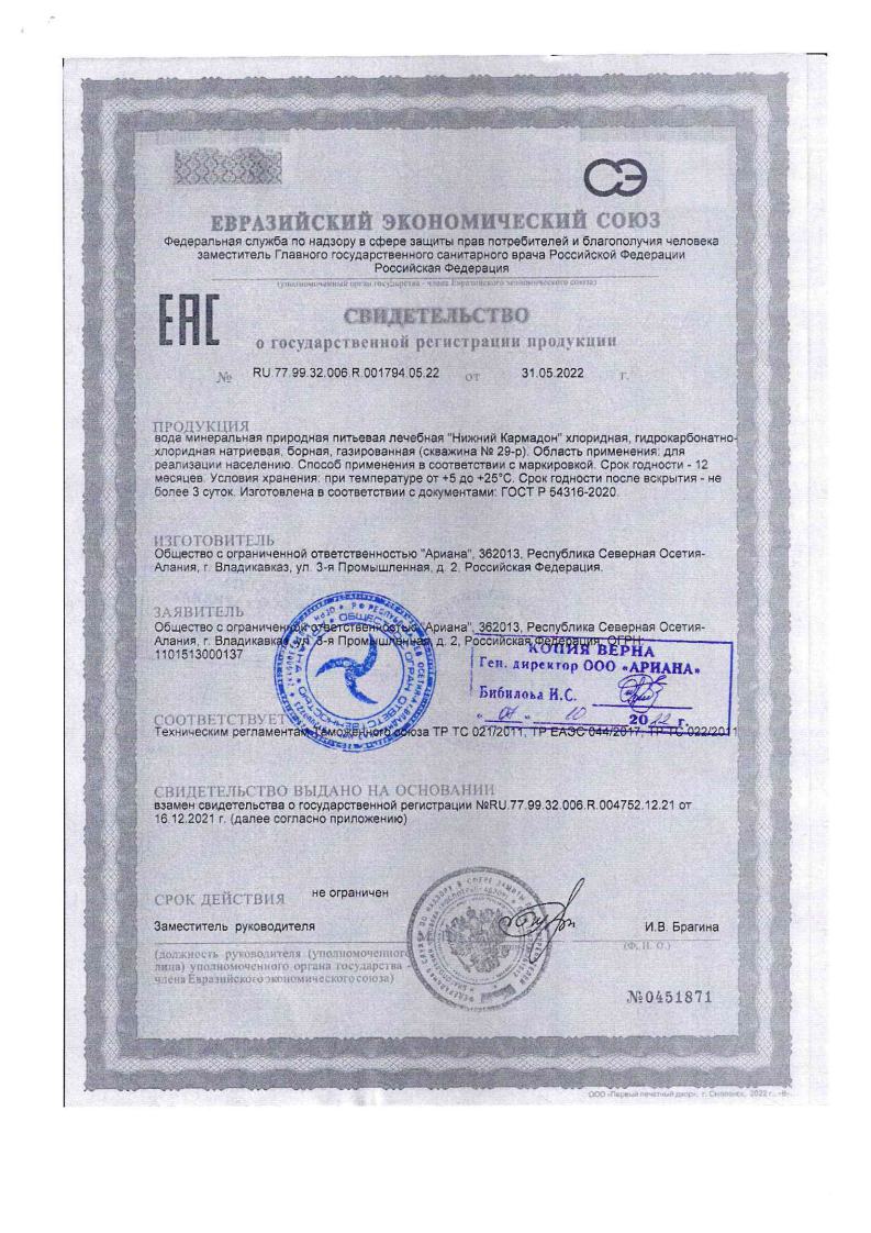 Вода «Кармадон Ариана» участвует в формировании костной ткани, помогает усвоению кальция, предупреждает развитие остеопороза. Бор, содержащийся в составе воды, способен нормализовать гормональный баланс, поддерживая в организме равновесие тестостерона и эстрогенов, а йод необходим для профилактики заболеваний щитовидной железы.