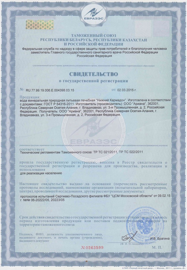 Минеральные воды Кармадона со второй половины XIX века используются в лечебных целях. После схода ледника в Кармадонском ущелье, инфраструктуру пришлось восстанавливать. ЗАО «Ариана» была проведена серьёзная работа с привлечением гидрогеологов и команды альпинистов. В результате были восстановлены 2 скважины и проложен уникальный минералопровод длиной более 12 км.