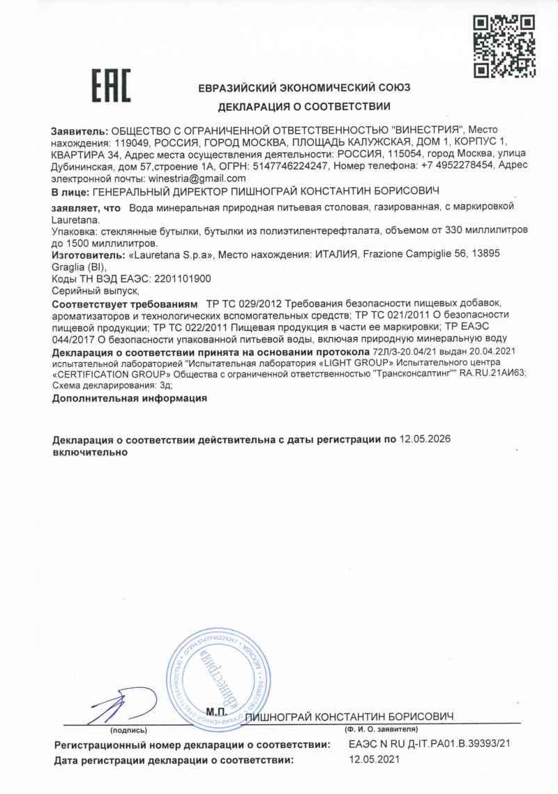Lauretana — кристально-чистая минеральна вода, которая отлично утоляет жажду, оздоравливает организм и омолаживает его. Она добывается напрямую из скальной породы, откуда вода под естественным природным напором бьет ключом. Благодаря низкой минерализации, вода оказывает благотворное влияние на организм.