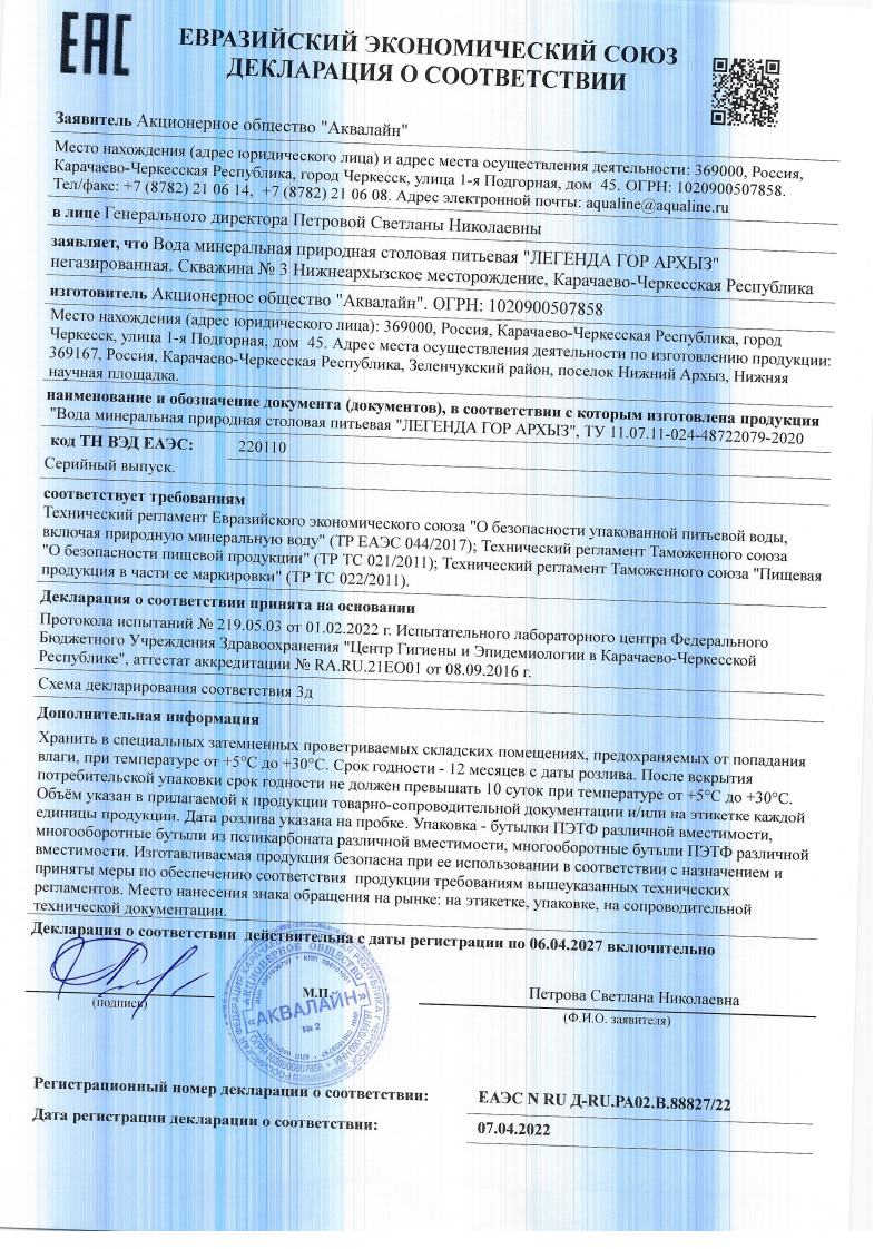 "Легенда Гор Архыз" одобрена Роспотребнадзором РФ для употребления взрослыми и детьми с первых дней жизни и внесена в рекомендованный для школ г.Москвы Реестр питания детей и подростков (Управление Роспотребнадзора РФ по г.Москве).