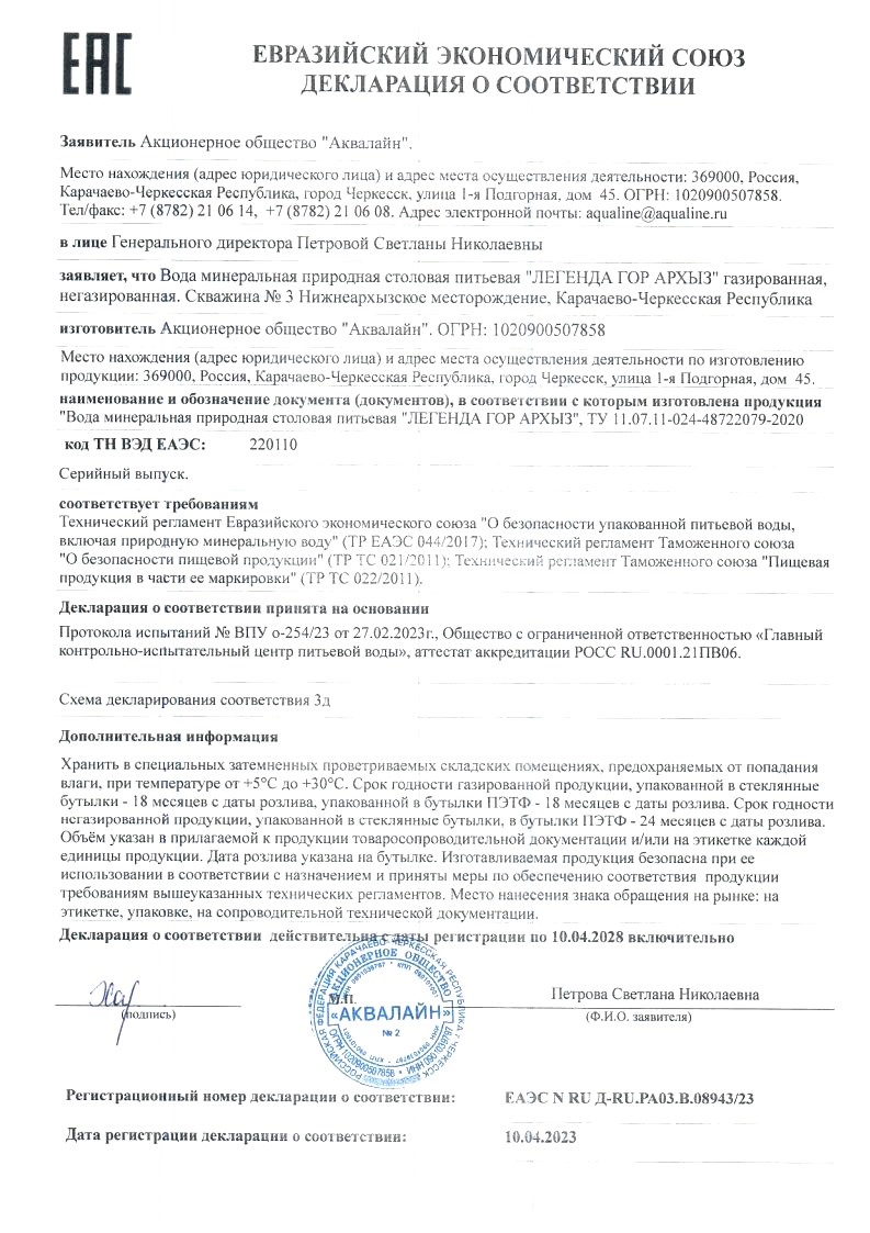 "Легенда Гор Архыз" одобрена Роспотребнадзором РФ для употребления взрослыми и детьми с первых дней жизни и внесена в рекомендованный для школ г.Москвы Реестр питания детей и подростков (Управление Роспотребнадзора РФ по г.Москве).