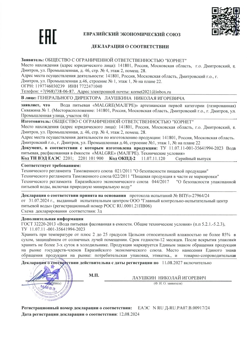 Вода MALGRE - aртезианская, озонированная вода богата магнием, кальцием и натрием, обладает повышенной мягкостью и приятной свежестью.