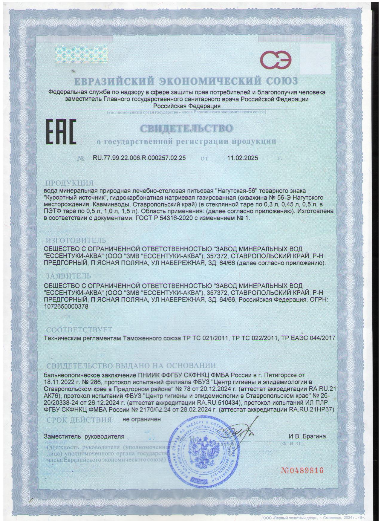 Вода скважины №56-Э отвечает требованиям нормативных документов и отличается стабильным хим-составом, что подтверждается постоянным контролем за качеством воды. ГОСТ Р 54316-2020 с изм. № 1.