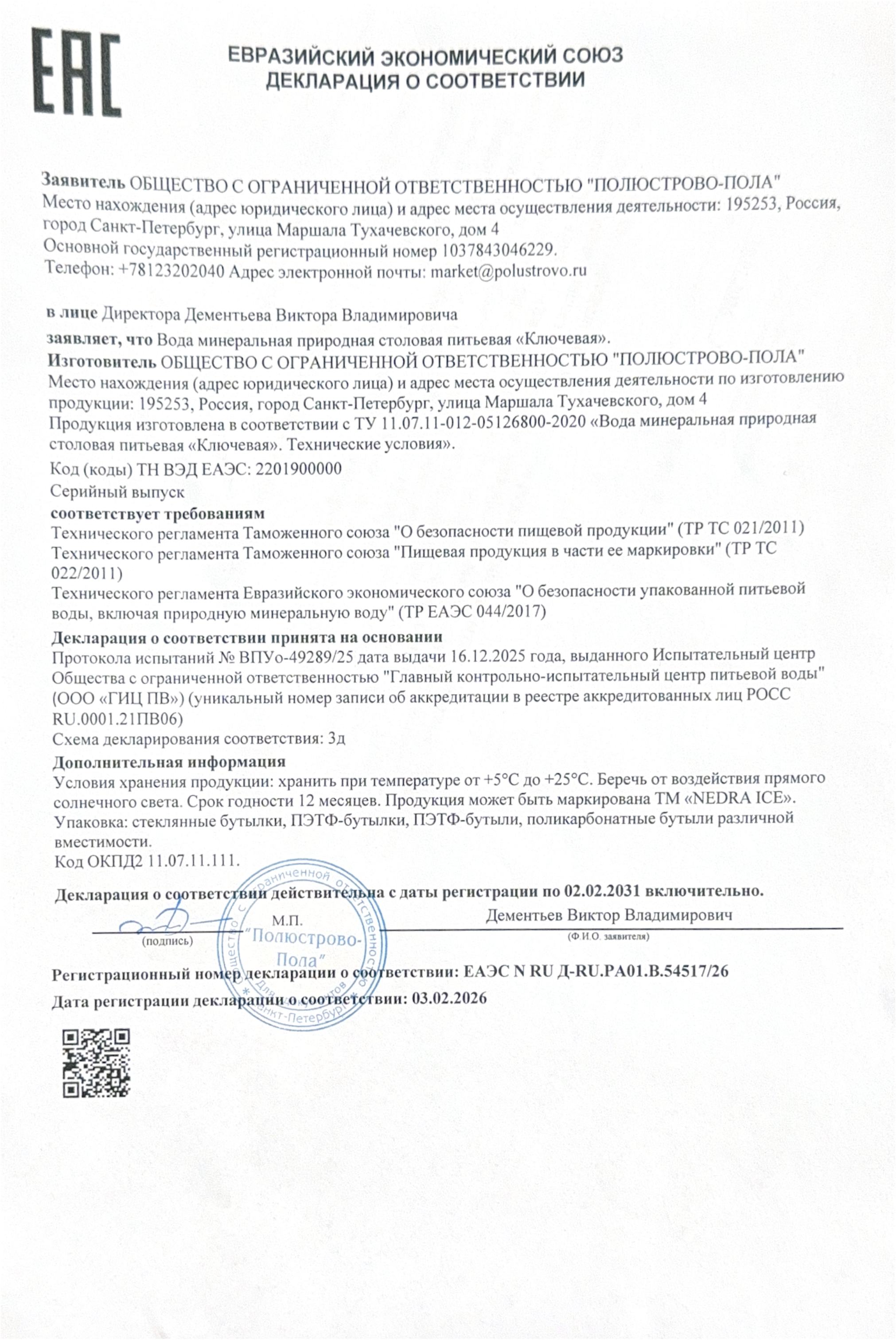 Минеральная вода "Nedra Ice" премиум-категории добывается из скважины, расположенной во Всеволжском районе Леннинградской области, глубиной 200 метров на