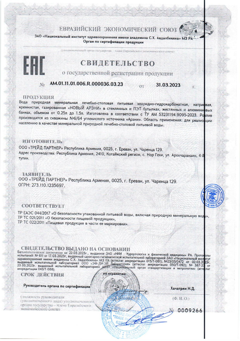 Минеральная вода «Новый Арзни» является лечебно-столовой минеральной водой и как и другие минеральные воды этого класса не рекомендуется в качестве ежедневного питья в течение длительного времени. Лечение минеральной водой «Новый Арзни» не проводится при обострении заболеваний, имеются другие противопоказания. При лечебном или длительном приеме необходима консультация специалиста.