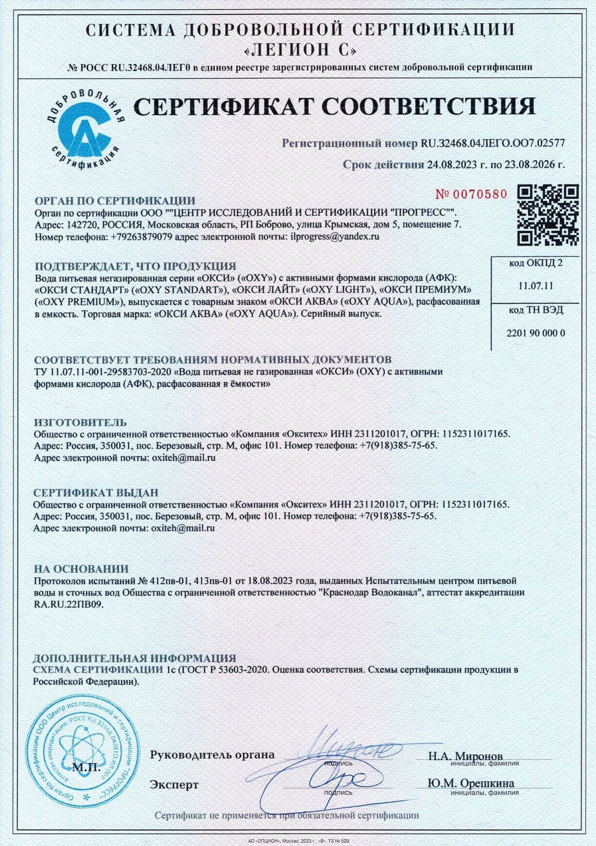 Вода ОКСИ ПРЕМИУМ - столовая питьевая гидрокарбонатная слабоминерализованная слабощелочная кислородонасыщенная (оксигенированная) мягкая (карбонат кальция в виде арагонита) «кластерная» вода, структурированная АФК - активными формами кислорода, (имеющая особую воссозданную, схожую с кристаллической решёткой льда, структуру с прочными упорядоченными связями между молекулами, которые объединены в кластеры – макромолекулы, полностью соответствующие структуре межклеточной жидкости), и с идеально сбалансированным минеральным составом, со значительно высокой энергетической активностью, способная к самоокислению кислородом и к длительному сохранению освобождающейся при этом энергии, а также к легкой отдаче этой энергии организму в наиболее ценной форме.