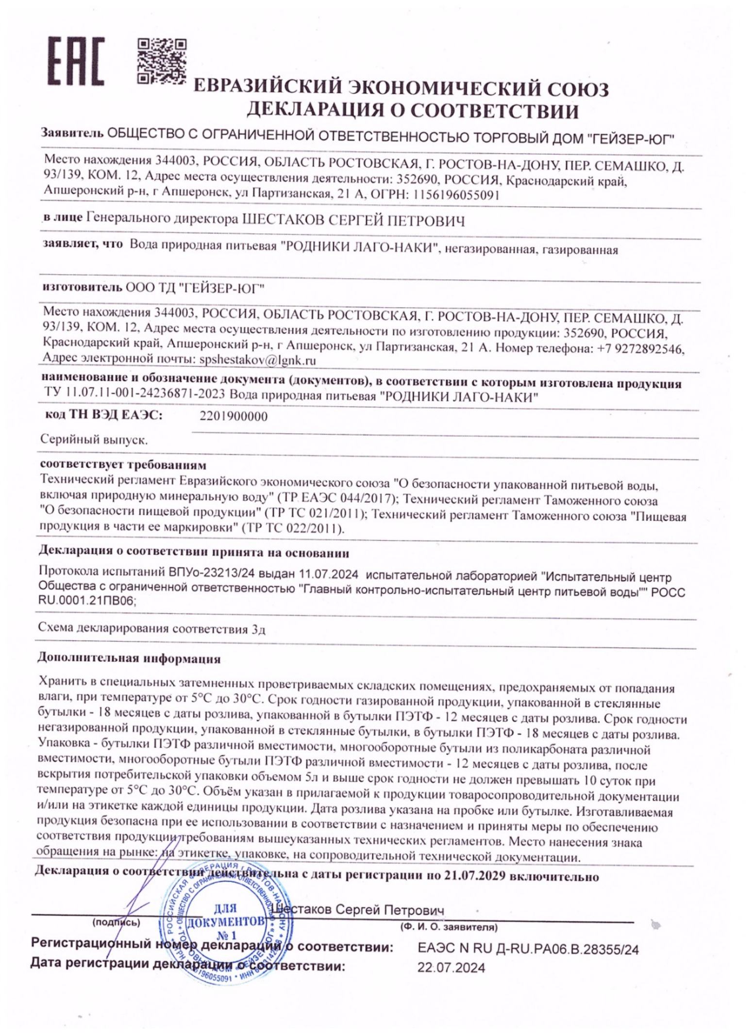 С гор Главного Кавказского хребта и Фишт-Оштенского ледника, находящегося на высоте 2000 метров, берут начало родники «Лаго-Наки». Вода обогащается полезными минералами при прохождении через горные породы, проходит систему обеззараживания и водоподготовки, сохраняет при этом мягкий вкус.