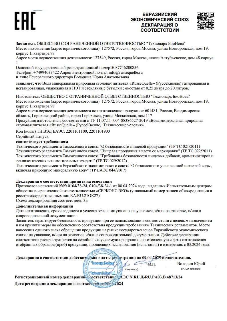Благодаря сбалансированному минеральному составу из более 150 природных микроэлементов, содержанию уникального минерала молодости Se (селен), гуминовым кислотам – RusseQuelle является главным продуктом здоровой и успешной жизни. Ph (кислотно-щелочной баланс) 7,4 указывает на слабощелочную среду воды, что усиливает её полезные свойства.