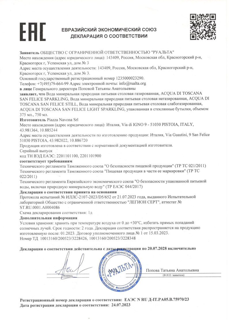 Минеральная вода Acqua di Toscana San Felice — это олигоминеральная вода с низкой общей минерализацией и содержанием натрия, что делает ее идеальной