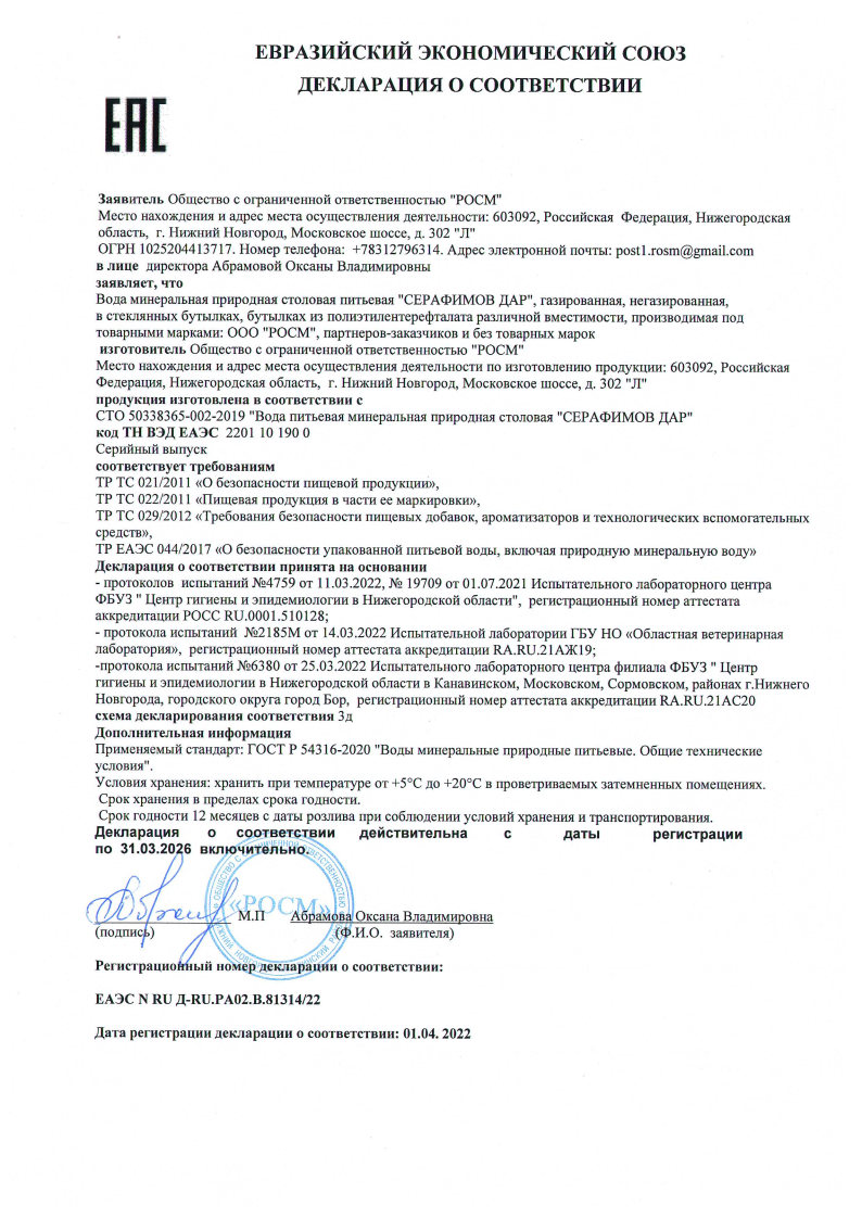 Вода «Серафимов Дар» по своему составу относится к минеральной природной питьевой столовой, сульфатно-гидрокарбонатной магниево-кальциевой. Благодаря высококачественному оборудованию и строгому контролю производства вода сохраняет свою естественную чистоту в процессе добычи и бутилирования. Это вода, подходящая для каждодневного употребления в неограниченных количествах