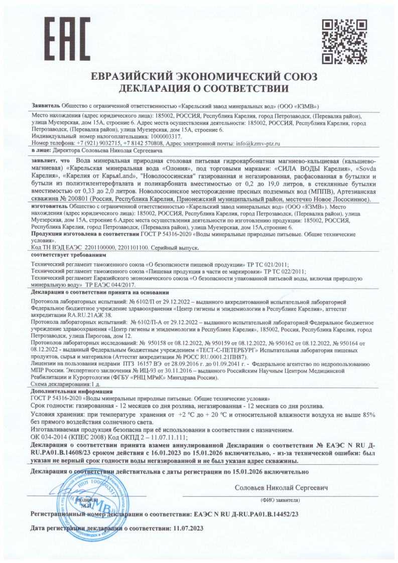 Добывается из чистейших источников Новолососинского месторождения пресных подземных вод в Республике Карелия, артезианская скважина №200801. Вода «Сила воды Карелия» имеет уникальный состав – в ней содержится мало сульфатов и бикарбонатов, благодаря чему она благотворно влияет на организм человека, оздоравливая его. А содержание в ней кальция и кремния способствует здоровому состоянию костей и эластичности кожи. Вода не подвергается химической обработке, проходя природный путь очищения. Не имеет каких-либо противопоказаний и может употребляться без ограничений, а низкий индекс жесткости в 0,6-1,5 мг-экв/л позволит сохранить вашу бытовую технику на долгие годы и избавить вас от проблем с накипью.