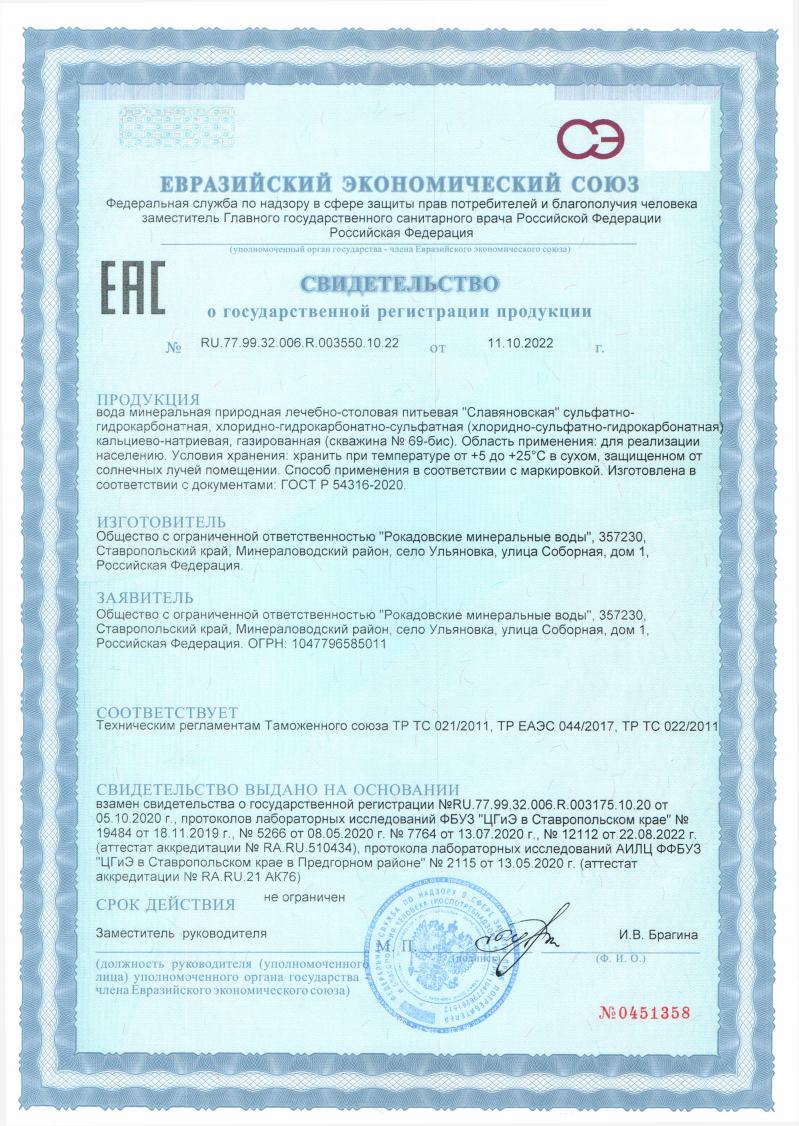 «Славяновская» — минеральная вода, добываемая на Кавказских Минеральных Водах, в городе-курорте Железноводске. Уже не первое столетие о ее целебных свойствах известно в России и далеко за ее пределами. Богатая минералами и микроэлементами, вода «Славяновская» также обладает приятным вкусом. Эта лечебно-столовая газированная вода известна своим благотворным влиянием на ЖКТ (желудочно-кишечный тракт). Подходит для лечения и профилактики болезней ЖКТ и других органов вне фазы обострения. Вода насыщена минералами и микроэлементами, а также обогащена природными газами.