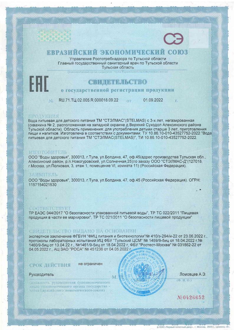 Вода Стэлмас - природная негазированная столовая питьевая вода с мягким вкусом, подходит для детей от 3-х лет. Её водоподготовка производится в процессе добычи с помощью максимально щадящих, самых современных методов и технологий, цель которых, не затронув ни в коем случае ее естество, сохранить в первозданном виде все её уникальные преимущества – мягкий родниковый вкус, идеальную структуру и сбалансированный минеральный состав, которые характерны для артезианских скважин именно той местности, в которой она и добывается – Тульская область, Алексинский р-н, неподалеку от пос. Новогуровский. Это абсолютно экологически чистая территория, никогда не подвергавшаяся воздействию каких бы то ни было вредных производств.