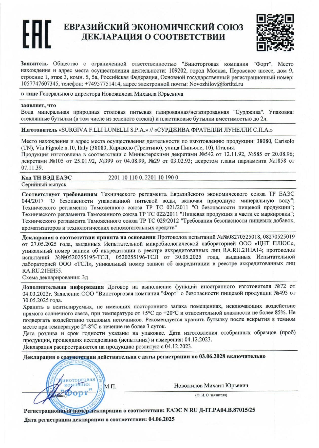 Сурджива разливается исключительно в стеклянные бутылки, что помогло очень быстро войти в список элитной минеральной воды. Это король в лучших ресторанах Италии, а теперь и по всему миру.