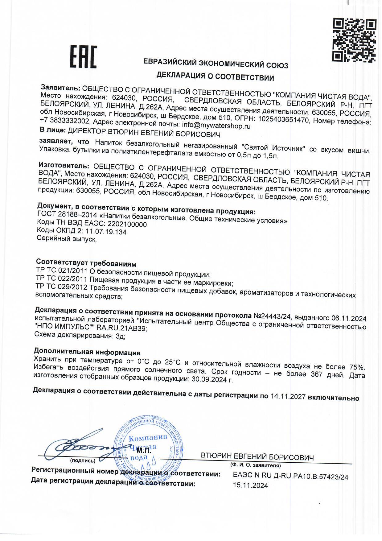 Вода питьевая негазированная "Святой источник" с вкусом вишни представляет собой идеальный выбор для тех, кто ценит чистоту и свежесть вкуса!