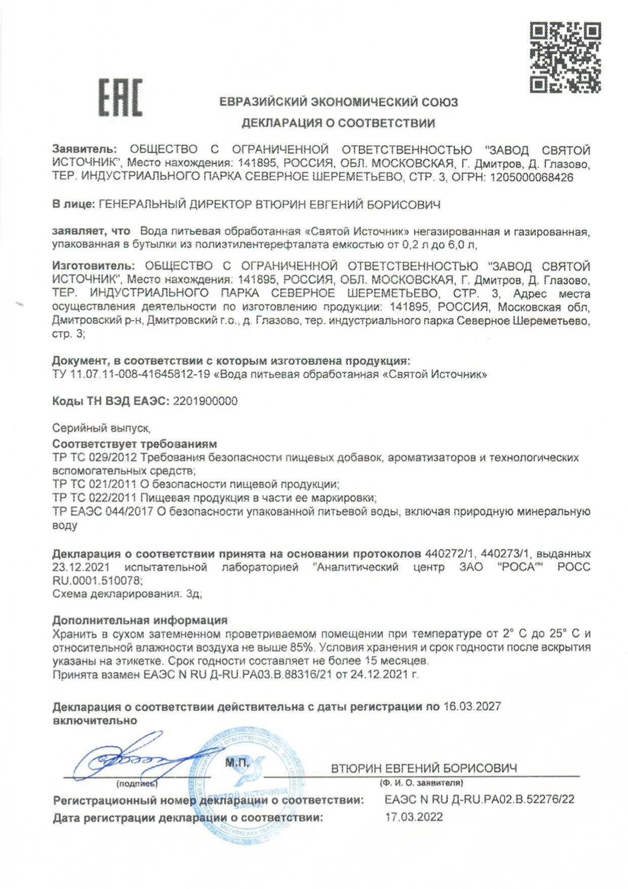 «Святой Источник» – питьевая вода, при производстве которой используется природная вода, добытая из артезианских скважин.