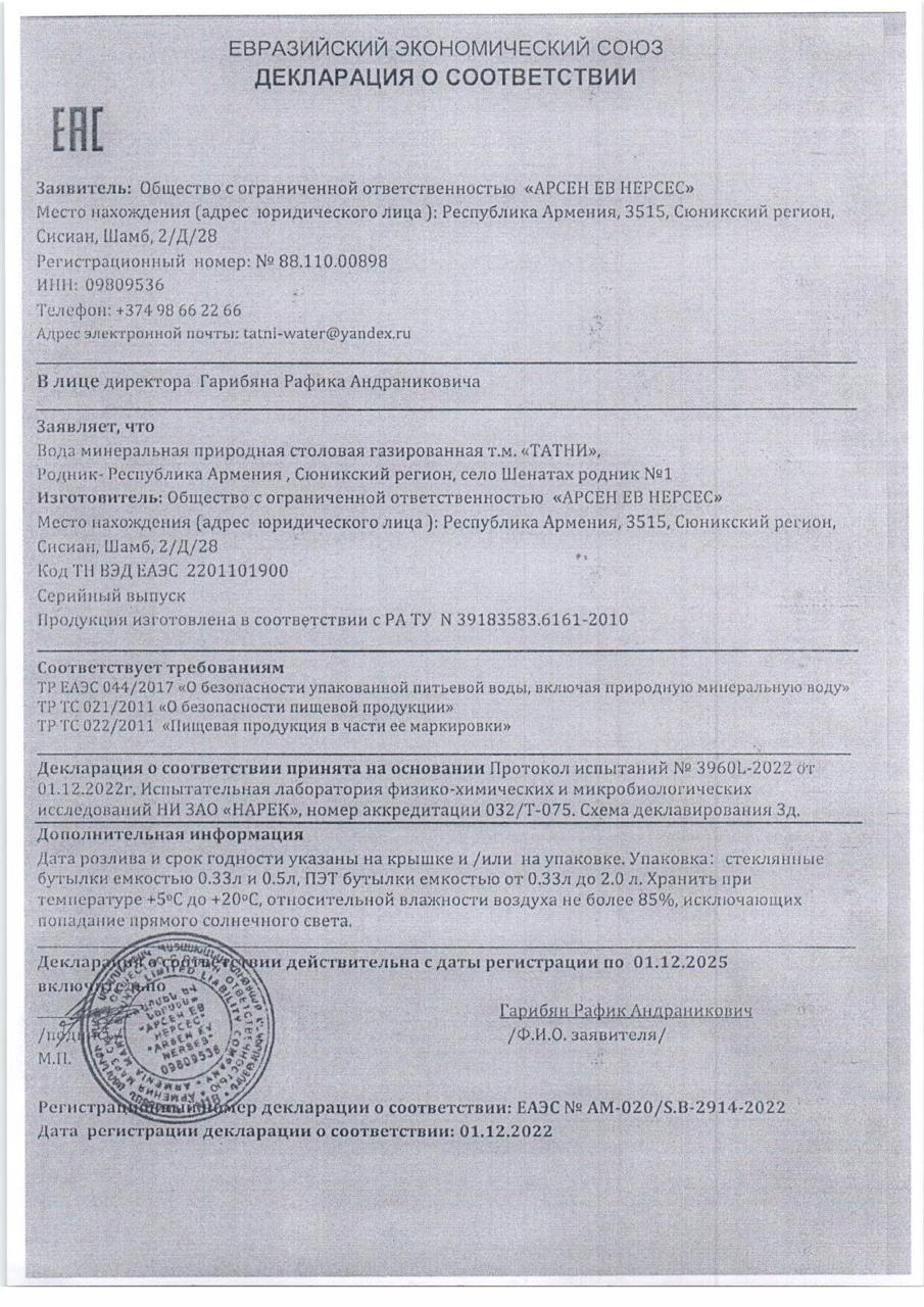 Минеральная природная питьевая вода «Татни» добывается из источника на склоне Зангезурского хребта в экологически чистой горной области Республики Армения.