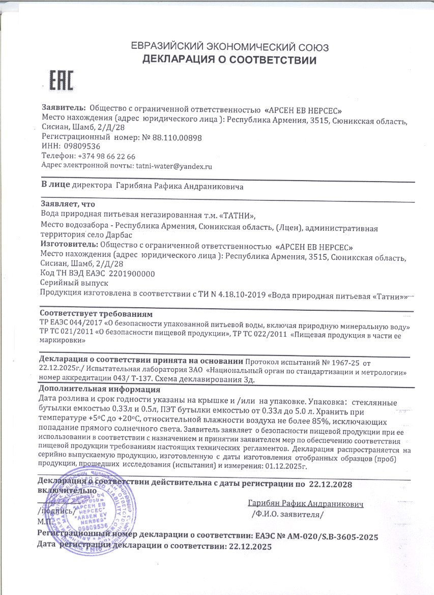 Уникальность «Татни» в том, что источник поразительно стабилен. При огромных перепадах температур (летом в горах до плюс 40, зимой те же 40, но с минусом) температура воды «на выходе» из родника всегда одинаковая. Плюс семь по Цельсию. И уровень минерализации тоже остаётся практически постоянным – 1,3 грамма на кубический дециметр. Специалисты геологического института, проводившие по заказу фирмы «Реноме» исследования качества воды, удивлялись – как такое может быть?Феномен «Татни» заинтересовал учёных ещё в советское время.Вода не только целебная, но и очень вкусная – по мнению специалистов-дегустаторов она более всего напоминает известную французскую марку «Перье». Умеренный уровень минерализации позволяет пить «Татни» постоянно и в любых количествах без консультации с врачом.