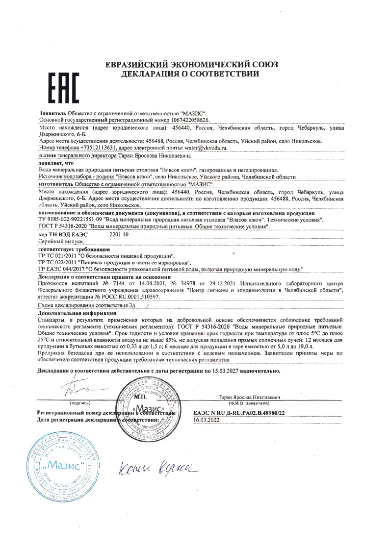 Родник "Власов Ключ" находится в экологически благоприятном районе на расстоянии свыше 100 километров до ближайших промышленных предприятий. Источник берет свое начало в недрах Уральских гор, пройдя многократную естественную очистку, выходит на поверхность в их предгорьях.