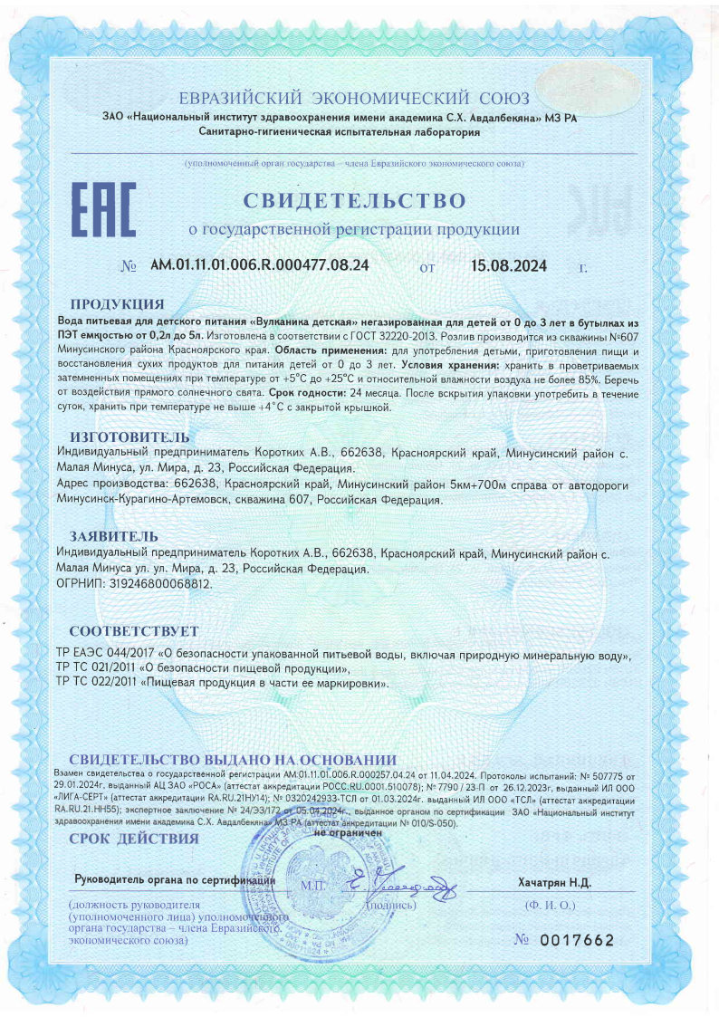 Природная вода для детского питания «Вулканика детская» (Vulcanica baby) высшей категории качества, негазированная, со сбалансированным составом минералов и микроэлементов. Не требует кипячения.