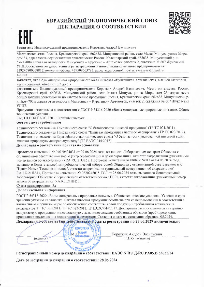 Природная минеральная столовая питьевая вода Vulcanica высшей категории качества, негазированная, со сбалансированным составом минералов и микроэлементов.